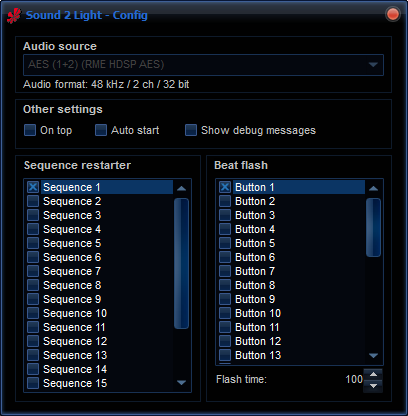When you click the Config button, a config window appears where you can configure your audio source, sequence restarter and beat flash buttons. You can optionally leave the config window open and drag it aside so you can control both the S2L main window and the config window. For easy and fast access, sequence restarter and beat flash buttons are now lists instead of pull down boxes.